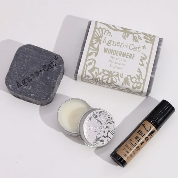 Discover the charm of Agnes & Cat Gift Sets, Lake Breeze brings together a Windermere soap bar, a Seasalt & Moss solid shampoo bar, a Salted Caramel lip balm and a Sleep essential oil roll-on made with chamomile, lavender and neroli.