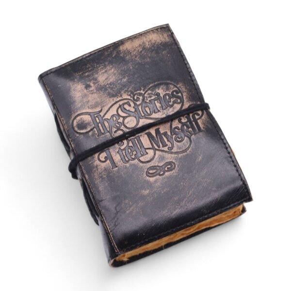 Celebrate the art of self‑reflection with this exquisitely embossed “The Stories I Tell Myself” leather notebook. Crafted in rich black leather and finished with a deeply textured deckle‑edge paper block, this compact journal invites you to pause, reflect, and rewrite your own narrative—one page at a time.