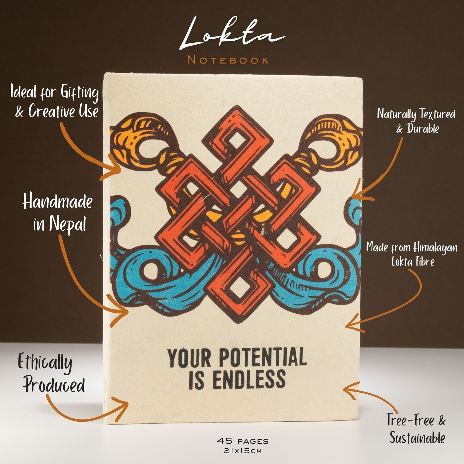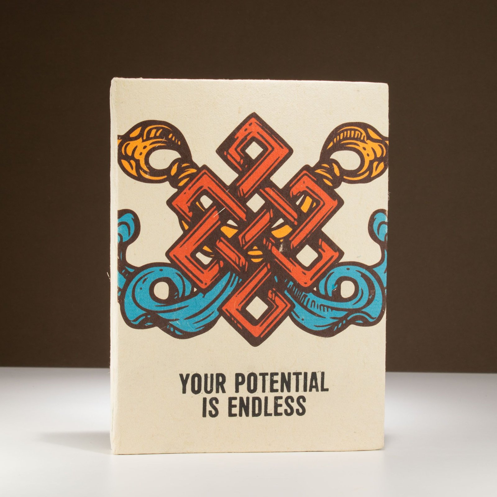 Uplifting, practical, and full of handmade charm, the Lokta Inspiration Notebook – Your Potential makes a bold positive statement from the very first glance. The cover features a vibrant red and orange motif paired with the empowering phrase “Your Potential is Endless,” encouraging confidence and creativity every time it’s picked up.